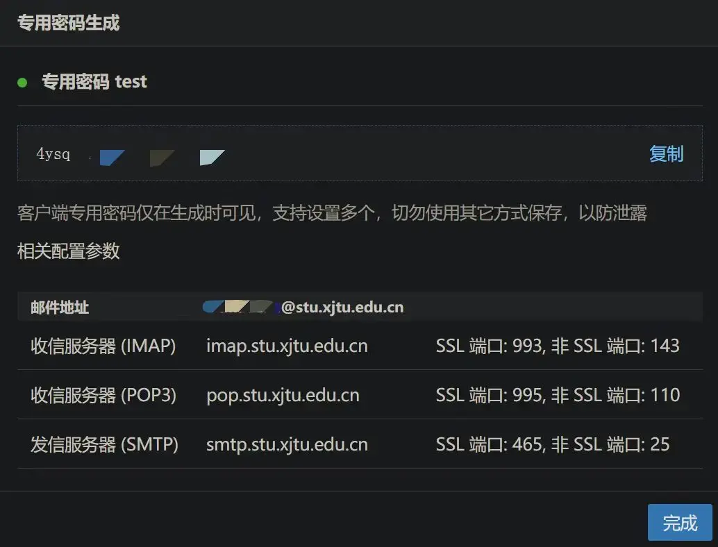 随后便可获得专用密码和邮件地址。注意,专用密码仅在生成时可见,注意保存。