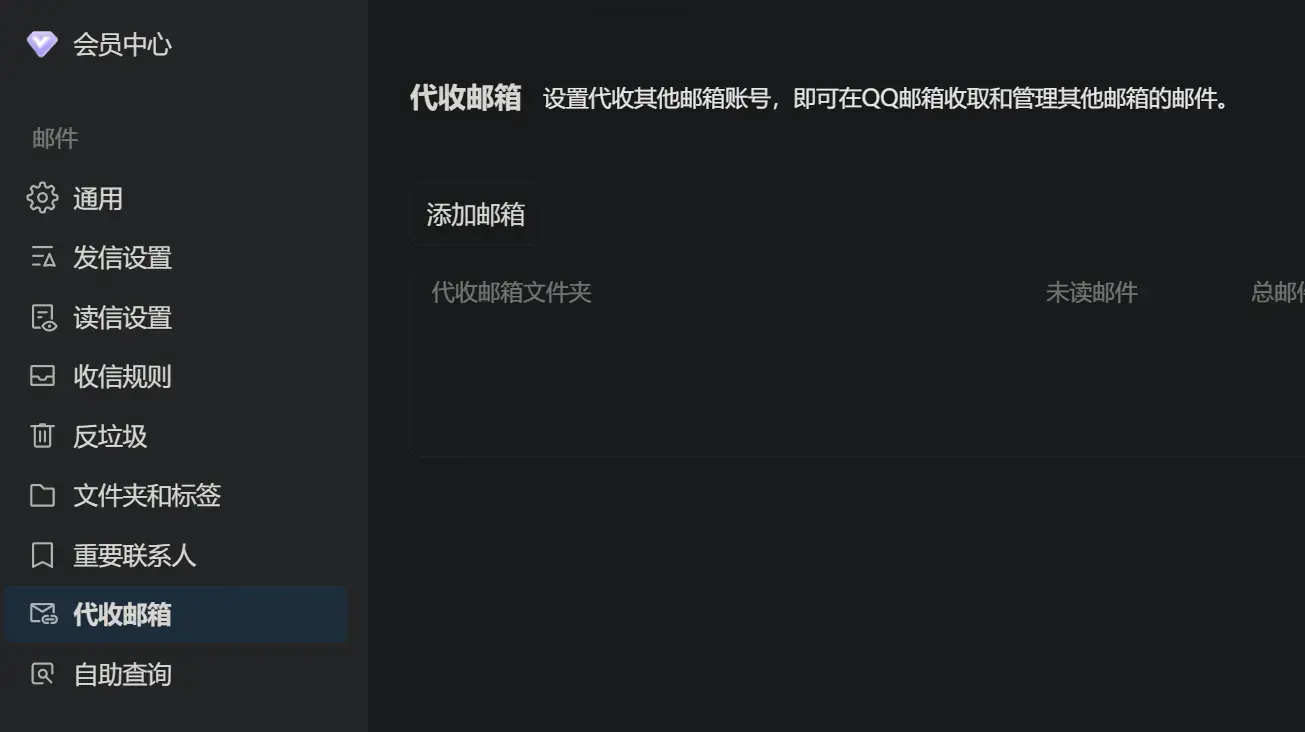 登录QQ邮箱,选择设置->代收邮箱 ,点击添加邮箱 ,填写需要代收的邮箱,此处为学校邮箱,点击下一步,填写之前获取的专用密码,点击添加。此时应显示添加成功,建议暂时不收取邮件。