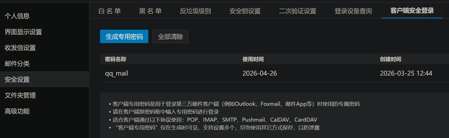 登录学校邮箱,选择设置->安全设置->客户端安全登录 ,点击生成专用密码 ,密码名称自拟。